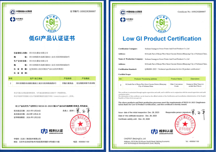 光友32年打造薯類方便主食健康品質(zhì):光友薯業(yè)32年來,專做健康薯業(yè),在中國乃至世界把紅薯、馬鈴薯做成一大健康主食產(chǎn)業(yè)。光友薯業(yè)歷經(jīng)32年來,光友綿陽米粉低GI健康方便主食發(fā)布,是繼光友酸辣粉低GI健康方便主食后,又一個(gè)健康爆款產(chǎn)品上市。光友低GI健康薯類方便主食是經(jīng)光友薯業(yè)技術(shù)創(chuàng)新,經(jīng)國家權(quán)威檢測(cè)機(jī)構(gòu)營(yíng)養(yǎng)成分檢測(cè)和臨床試驗(yàn),取得低GI食品報(bào)告,由中國權(quán)威認(rèn)證機(jī)構(gòu)中檢科檢測(cè)后,為光友薯業(yè)頒發(fā)了光友綿陽米粉低GI健康方便主食認(rèn)證證書,這是線上線下各位領(lǐng)導(dǎo)、嘉賓、朋友,關(guān)心支持光友32年來共同取得的成果!