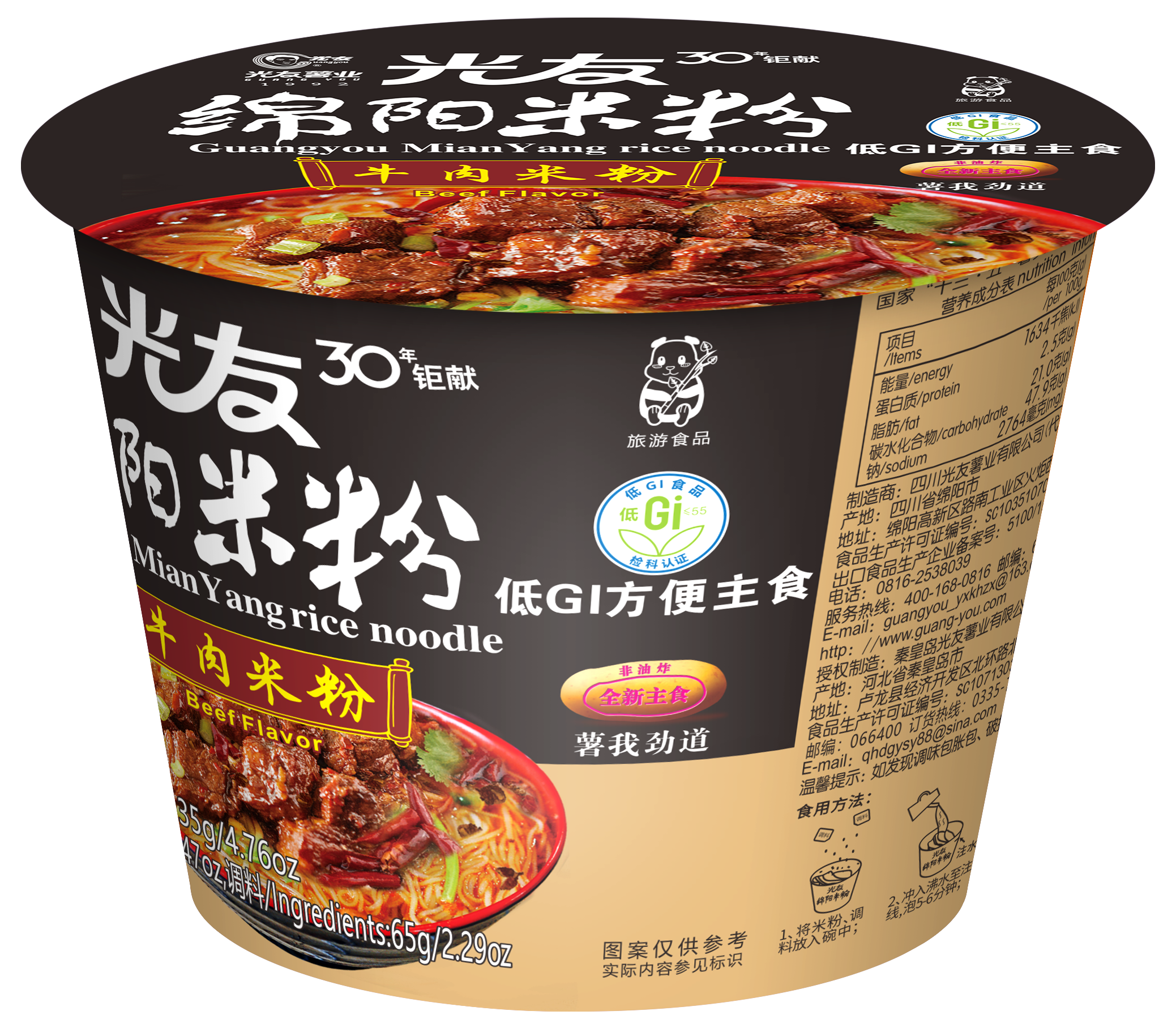 光友綿陽米粉牛肉米粉低GI健康主食技術(shù)創(chuàng)新點(diǎn):1、光友綿陽米粉牛肉米粉中碳水化合物主要由粉餅中的大米、淀粉和馬鈴薯組成,其它調(diào)味料包如醬包、粉菜包、酸菜包提供了一小部分碳水。調(diào)味料包中含有的油脂、膳食纖維等成分可通過阻礙淀粉與消化酶的接觸,從而延緩淀粉的消化,進(jìn)而降低餐后血糖波動(dòng)。2、光友綿陽米粉在米粉餅制作過程中應(yīng)用了高溫?cái)D壓熟化、老化及冷凍工藝,淀粉分子結(jié)構(gòu)重新排列組合,由高能量轉(zhuǎn)化為低能量。食用后在體內(nèi)消化吸收慢,不容易饑餓,不致使血糖升高過快,有助于維持正常的血糖水平,減少饑餓感,為糖尿病人及其亞健康人群提供了良好的食物來源。3、調(diào)味料中含有的油脂、膳食纖維等成分可通過阻礙淀粉與消化酶的接觸,從而延緩淀粉的消化,進(jìn)而降低餐后血糖波動(dòng)。
