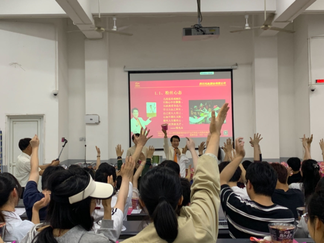 大家都踴躍地加入到活動當(dāng)中,一個個同學(xué)接連勇敢走上舞臺,與光友薯業(yè)董事長鄒光友熱情交流互動。許多學(xué)子登臺共跳光友粉絲舞,現(xiàn)場氣氛徹底點燃。