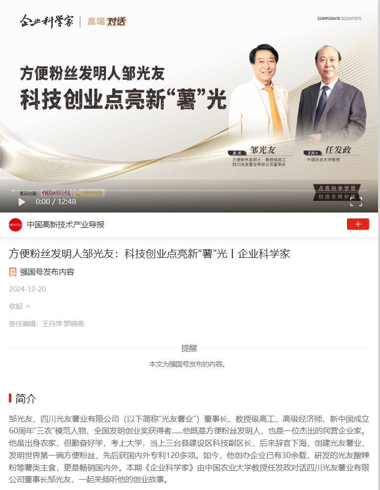 轉(zhuǎn)載學(xué)習(xí)強(qiáng)國中國高新技術(shù)產(chǎn)業(yè)導(dǎo)報——方便粉絲發(fā)明人鄒光友:科技創(chuàng)業(yè)點亮新“薯”光丨企業(yè)科學(xué)家